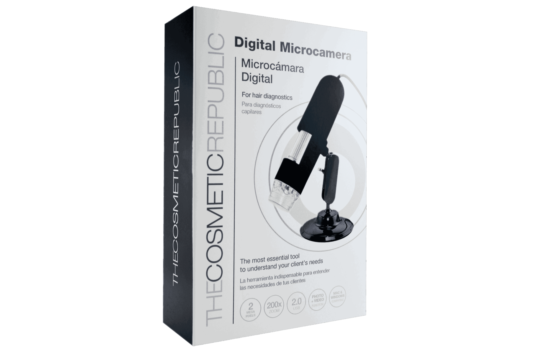 Met de digitale microcamera van The Cosmetic Republic kunt u de hoofdhuid en het haar in realtime analyseren met tot 200x zoom op het computerscherm.